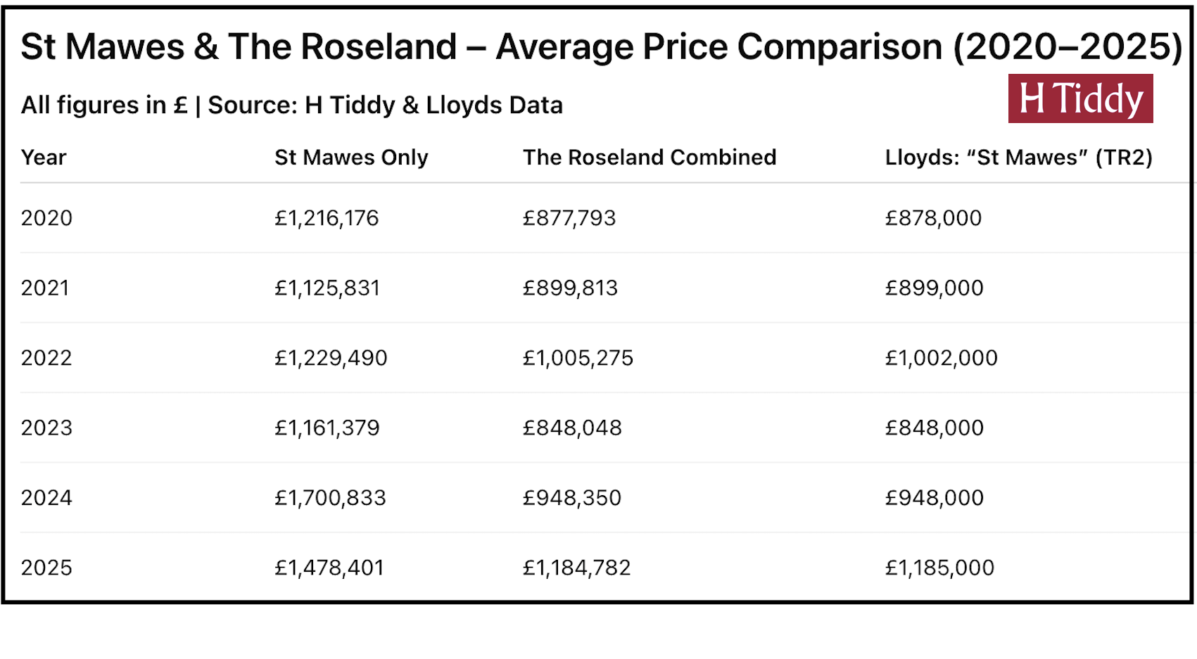 Sector-wide averages therefore reflect a broad geographic and property mix. While accurate at that level, they do not isolate the prime harbour-facing homes and central village positions that define St Mawes.