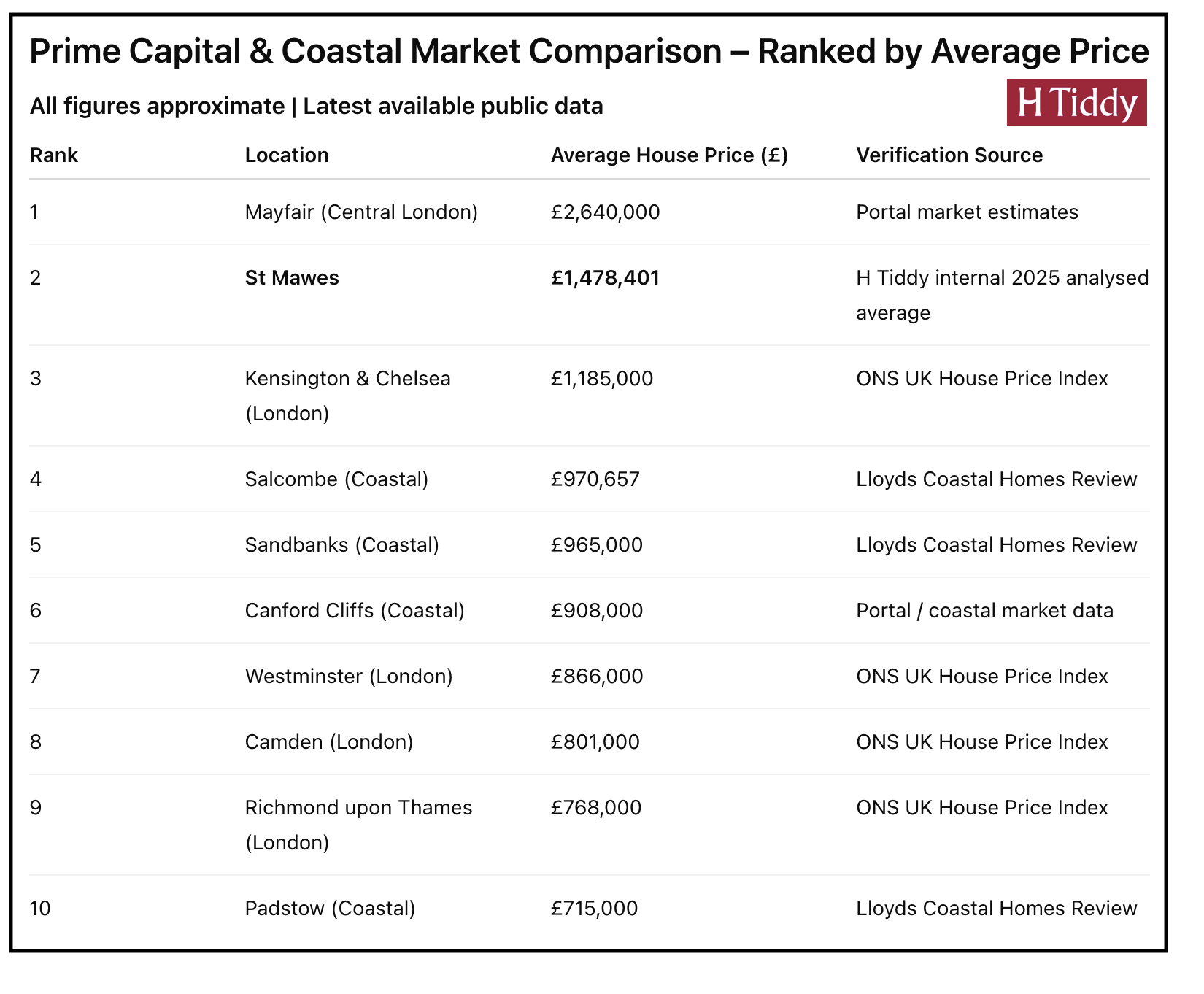 In comparative terms, this aligns with, and in some cases exceeds, average values recorded in established London boroughs. Recent ONS figures place Kensington & Chelsea at broadly comparable levels, while Westminster, Camden and Richmond upon Thames record lower averages. Among coastal locations, Sandbanks and Salcombe, often regarded as Britain’s most exclusive seaside enclaves, sit below St Mawes at average level.